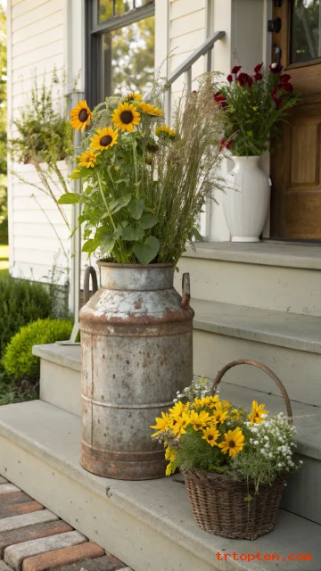 Set a vintage milk can by the front steps or gate. Add tall branches, sunflowers, or pampas stems for height. The shape is simple, so it fits many garden styles.
