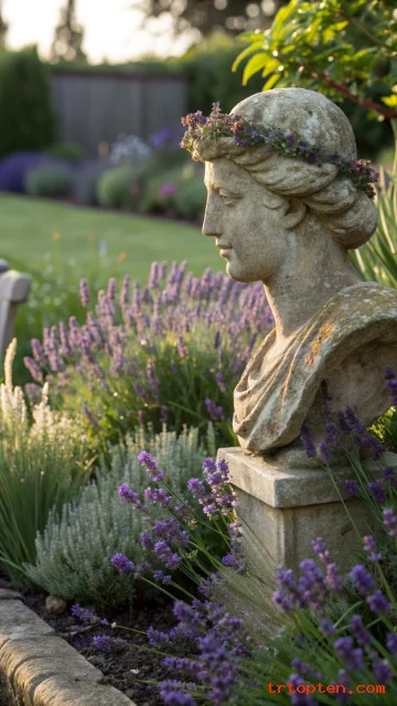 Add a small stone statue or bust in a flower bed. The aged surface looks timeless among blooms. It gives the garden an old estate feel without being too formal.