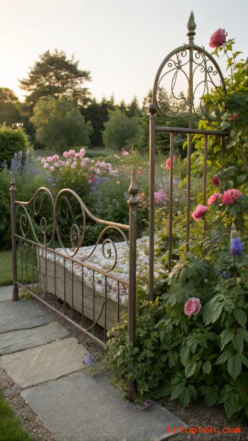 Use an antique metal bed frame as a garden boundary or climbing support. The curves and bars create a strong vintage statement. It looks especially charming behind flowers or along a walkway.