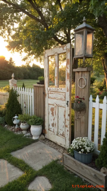 Lean an old door against a fence line as decorative gate art. The panels and peeling paint add instant vintage mood. You can frame it with plants for a cozy garden corner.