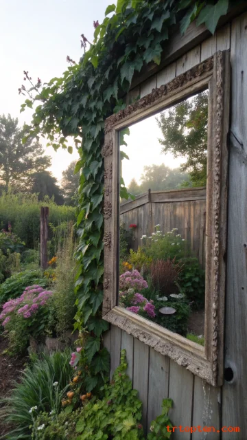 Mount an old mirror frame on a fence to reflect greenery. It makes small gardens feel bigger and brighter. A worn frame adds vintage beauty without extra clutter.