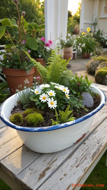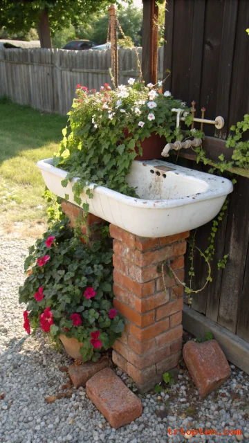Use an old porcelain sink as a bold vintage planter. The basin shape holds soil well and looks unique. It fits cottage gardens and quirky vintage yards.