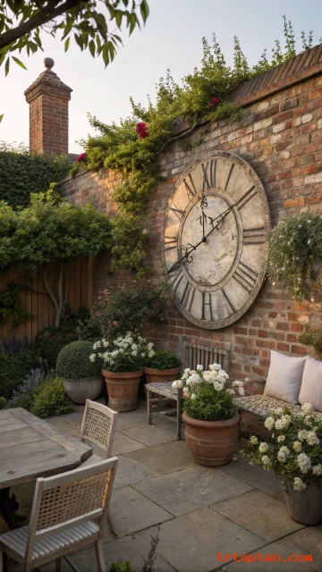Use a large vintage clock face as outdoor wall decor. Place it on a fence or brick wall as a focal point. The numbers add visual interest and a classic feel.