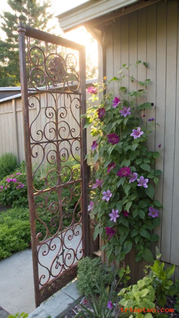 Use a salvaged gate panel as a trellis in a garden bed. The metal scrollwork looks vintage and adds structure. It also supports climbing plants in a beautiful way.