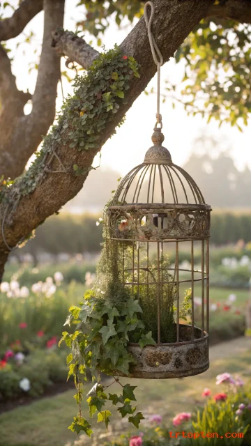 Hang an antique birdcage from a branch or porch hook. Place a small pot inside or let vines weave through the bars. The cage shape adds height and a romantic vintage feel.