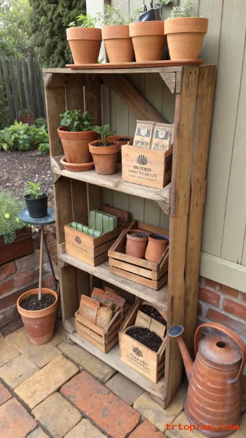 Stack old wooden crates to make easy garden shelving. The rough wood looks vintage and pairs well with clay pots. This works well on patios, porches, and near potting areas.