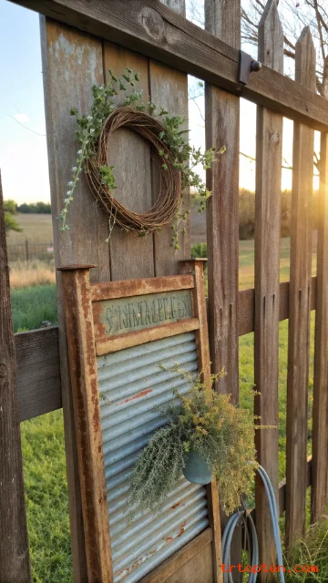 Hang a vintage washboard on a fence as simple garden art. The ridges and worn paint look charming and nostalgic. It adds detail without taking up ground space.