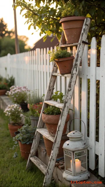Lean a weathered ladder against a fence or shed wall. Place pots on each rung to create a vertical garden with vintage charm. The worn wood adds warmth and makes simple plants look special.