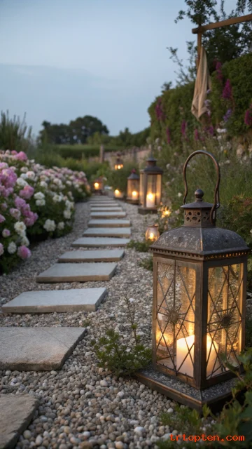 Line a garden path with antique-style lanterns. Choose lanterns with aged metal or distressed paint for a vintage look. The warm glow makes the garden feel calm at night.