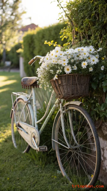 Choose a bike with chipped paint and a classic frame. Use white daisies or soft pink blooms for a sweet look. Place it near a hedge so it feels tucked in.