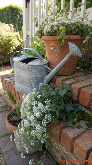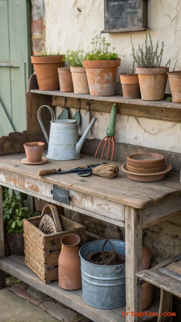 Create a vintage potting table area for decor and daily use. Use a worn wood table or an old workbench. Add classic items like clay pots, twine, and a small enamel pitcher.