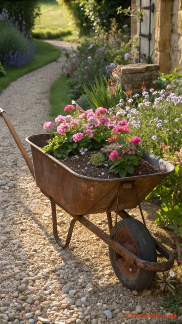 Park an old wheelbarrow in a visible spot like the yard entrance. Fill it with soil and plant seasonal blooms for a rolling garden look. The worn metal and wood handles feel classic and cozy.