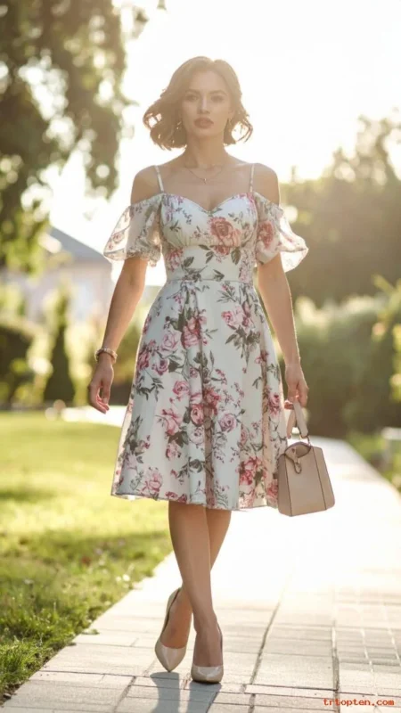 A floral midi dress feels romantic and easy for many weddings. The midi hemline looks balanced and suits both indoor and outdoor venues. Block heels add height while staying stable on grass and stone paths.