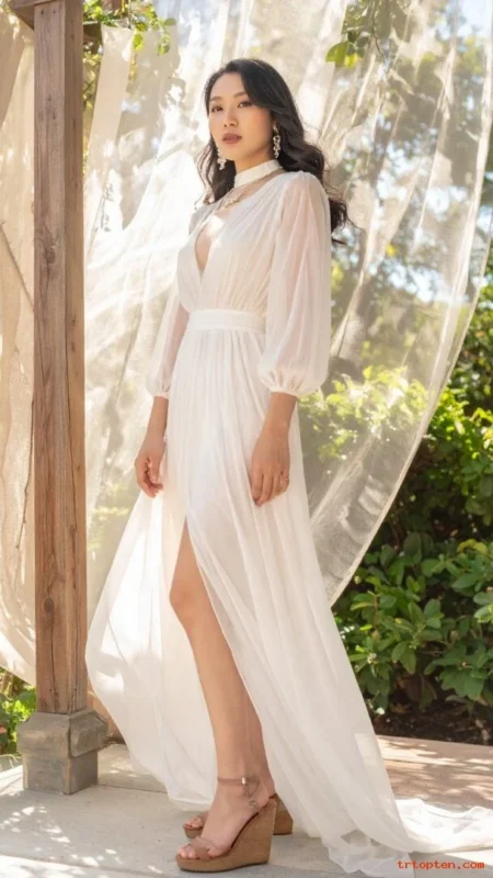 A chiffon maxi dress feels airy and elegant, especially outdoors. The flowy fabric moves well in photos and feels comfortable. Soft waves and a natural makeup look fit the light vibe.