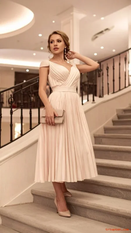 A pleated midi dress moves beautifully when you walk and dance. The pleats add texture that looks great in photos. Pearl earrings or a pearl hair clip adds a classic touch.