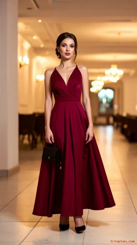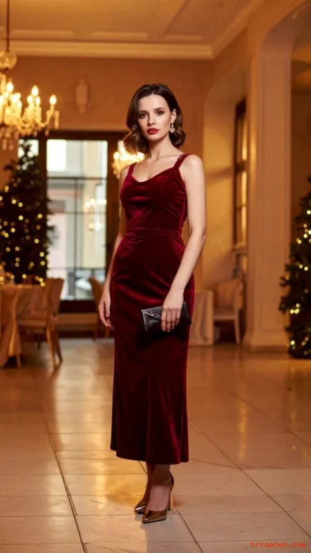 Choose a midi length for comfort and warmth. Add a faux-fur wrap if the venue feels cold. Keep makeup glowy to balance the deep fabric.