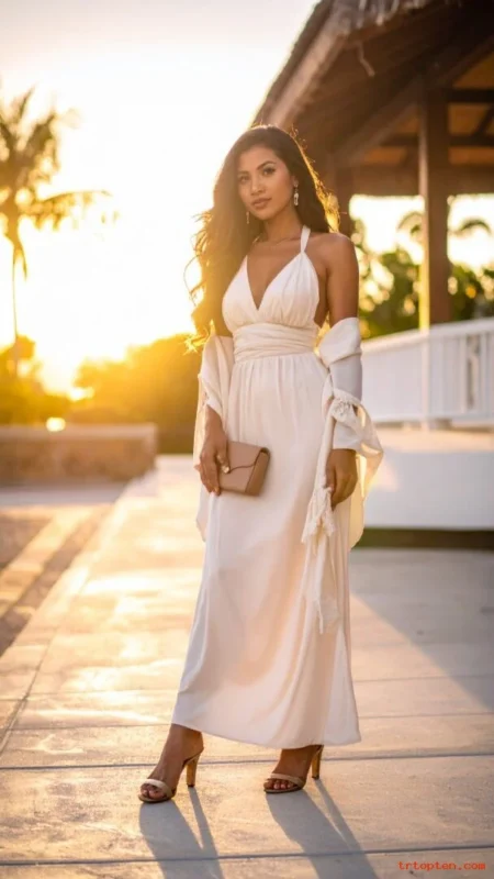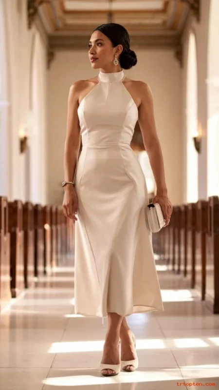 A halter neck dress highlights shoulders and looks sleek. It pairs well with strappy sandals and a small clutch. This outfit works best for warm-weather weddings.