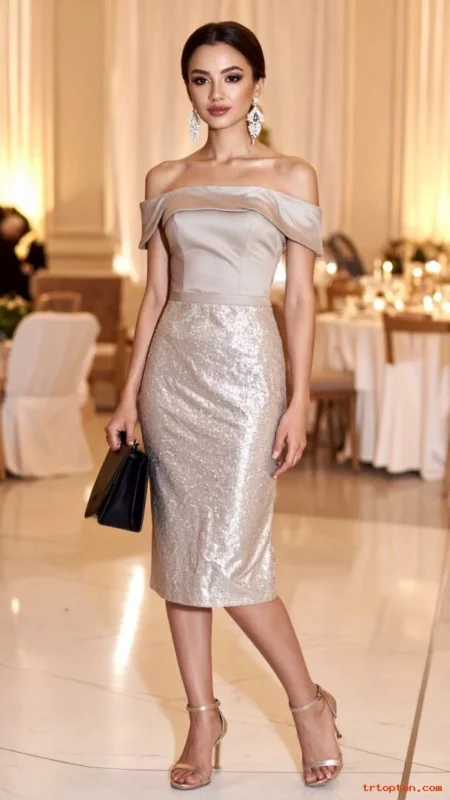 A sequin dress works best for evening weddings and party receptions. The sparkle brings instant glamour with little styling effort. Solid accessories stop the look from feeling busy.