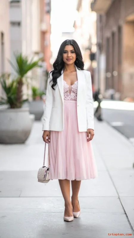 A pastel dress looks fresh for spring weddings and daytime events. A white blazer adds structure and warmth without hiding the dress. This combo works well for office-to-wedding transitions.