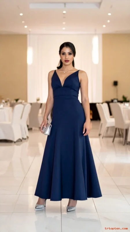 A floor-length gown fits black tie dress codes and formal evenings. Keep the silhouette clean for a modern feel. A simple clutch and classic heels complete the look.