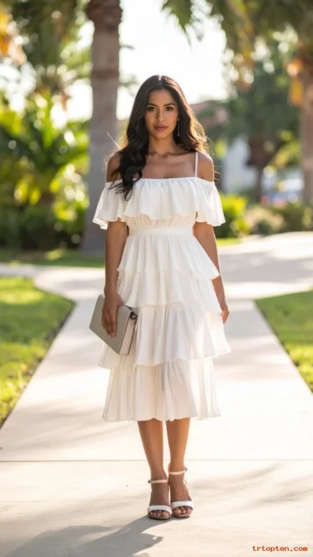 Choose ruffles in one area, like sleeves or hem, for a cleaner look. Wear simple sandals or low heels for comfort. Add a small clutch in a solid color.