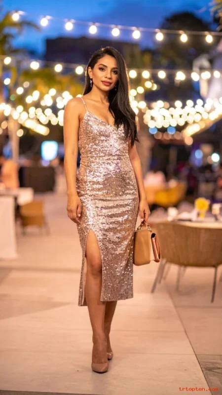 Choose one focal area, like a sequin midi dress, and keep shoes plain. Wear a sleek clutch in black, nude, or metallic. Keep hair simple so the dress shines.