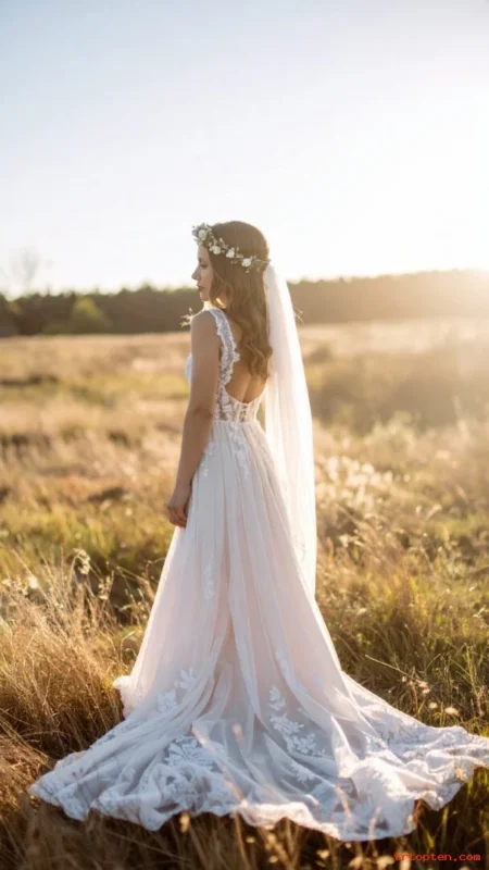 This style suits boho weddings and outdoor ceremonies. It also looks great with floral hair accents and lace details.