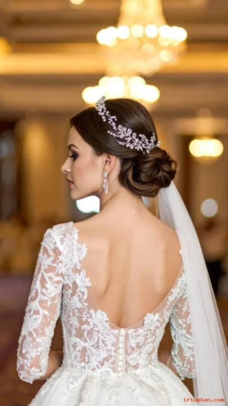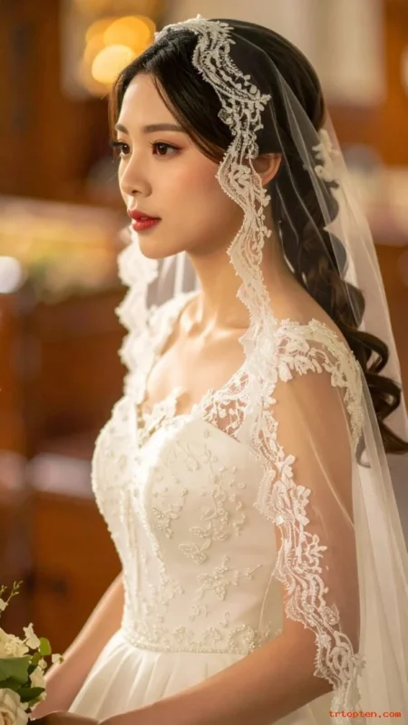 This style feels refined and traditional in the best way. It pairs beautifully with lace veils and simple earrings.