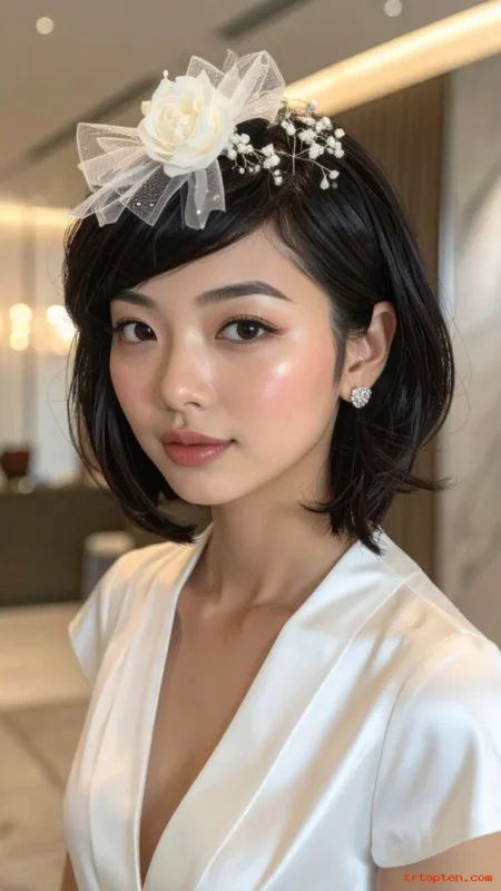 A short bob can look very bridal with the right veil clip. A soft bend adds shape without heavy curls.