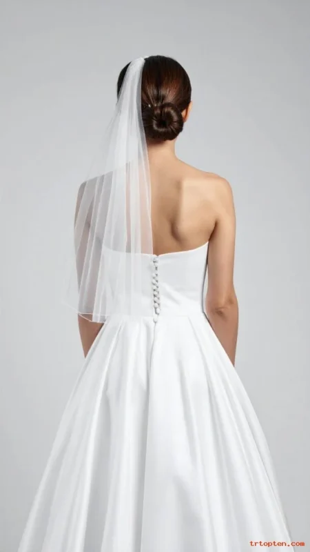 Balance the bun with a deep side part. Anchor the veil near the back but slightly to one side.This style flatters heart and oval face shapes. It pairs nicely with one-shoulder gowns and statement earrings.