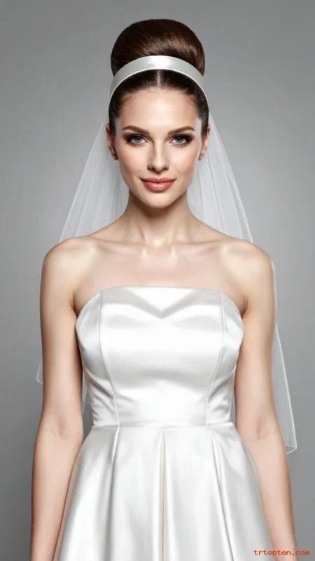 A sleek bun looks clean and refined. A satin headband adds a simple bridal accent under the veil.