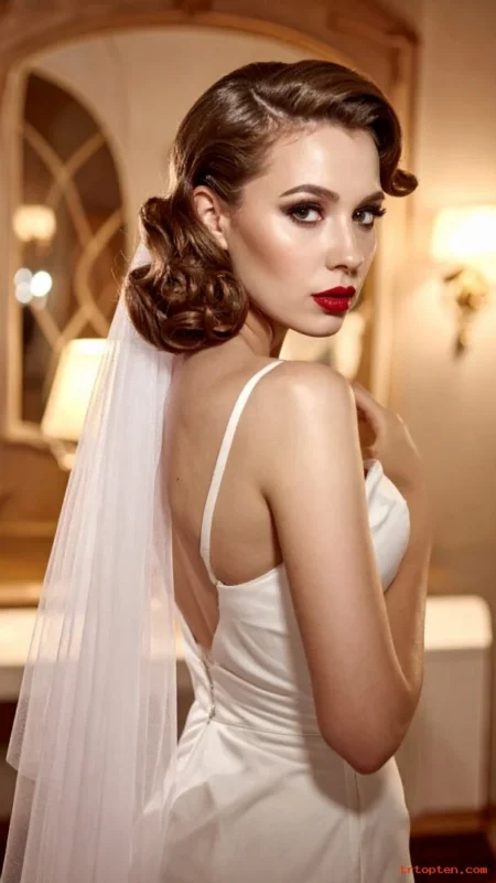 This style looks amazing with clean gowns and red lip makeup. It works best with a lighter veil so the waves stay defined.