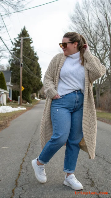 Pick a cardigan with large buttons and thick knit texture. Use a fitted thermal layer so the cardigan stays the focus. Add sneakers or ankle boots based on your day.