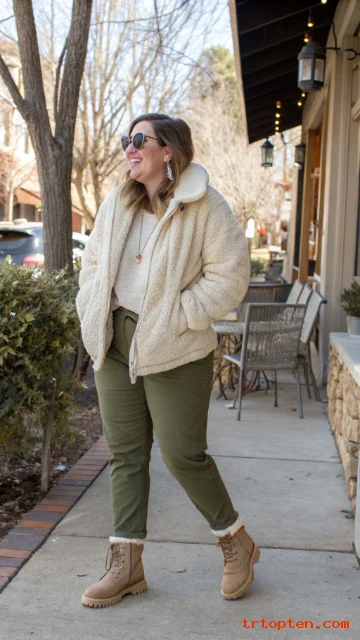 Choose neutral pants like black, khaki, or olive for a strong winter palette. Add sneakers for casual plans or boots for colder days. Keep the layers simple to let the sherpa jacket stand out.