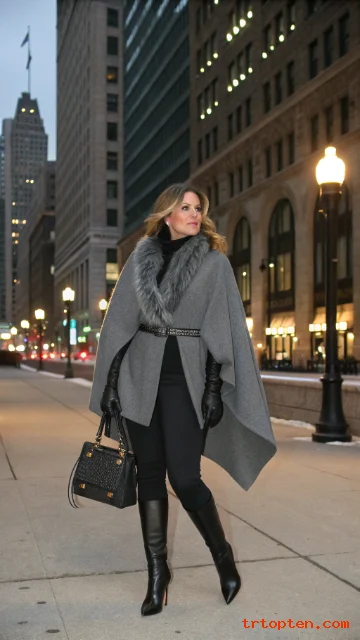Choose a cape in gray, camel, or black for easy styling. Add gloves for a polished winter detail. Wear heeled boots to give the outfit a dressier finish.