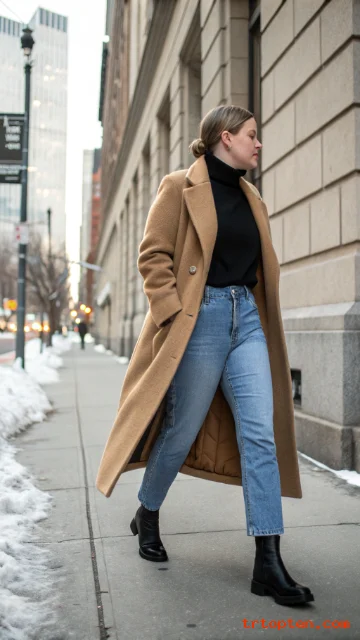 A long wool coat gives your outfit a clean shape and strong winter coverage. A fitted turtleneck keeps your neck warm and makes the coat look polished. Straight jeans balance the look and make it easy to wear every day.