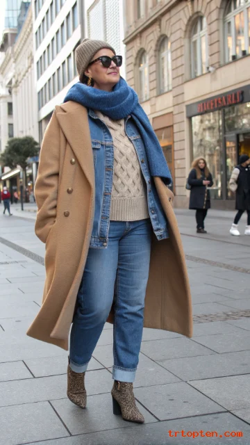 Choose a medium-wash denim jacket for a balanced contrast. Keep the wool coat neutral so the denim stands out. Add a thick scarf to lock in warmth and tie the look together.