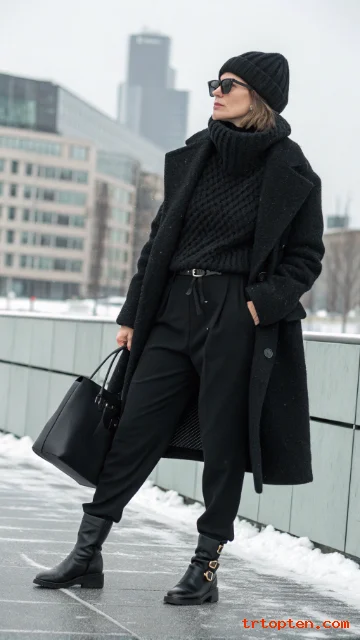A monochrome black outfit looks sleek and easy to build. Start with a black knit top and black trousers or jeans. Add a black wool coat to create a clean winter silhouette.