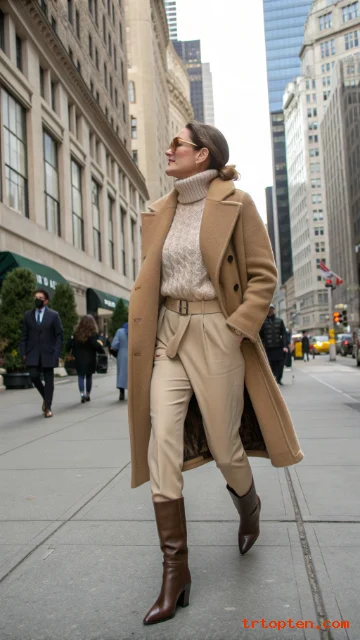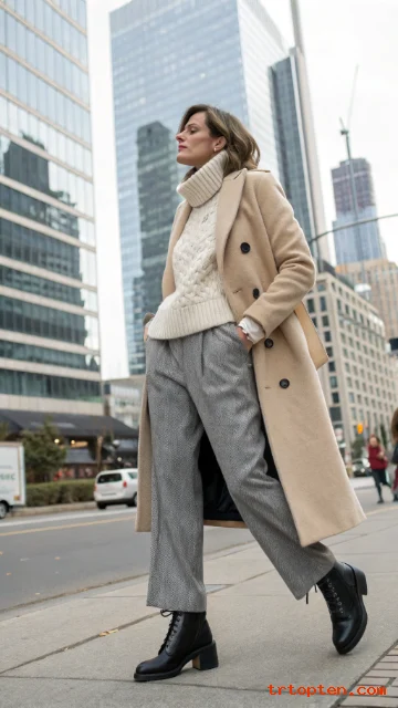 Choose a coat in camel, gray, or black for long-term use. Keep the sweater in a neutral or soft tone for a clean style. Add leather boots and a structured bag for a polished finish.