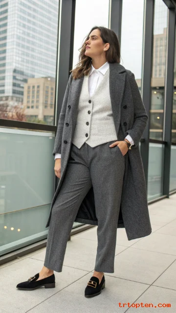An oversized blazer can look great in winter when the fabric is thick. A knit top keeps the outfit warm and soft. Thermal or wool-blend trousers give comfort and a tailored shape.