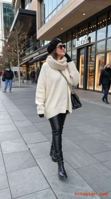 An oversized sweater gives comfort and warmth on cold days. Faux leather leggings add contrast and make the look feel modern. Boots anchor the outfit and make it winter-ready.
