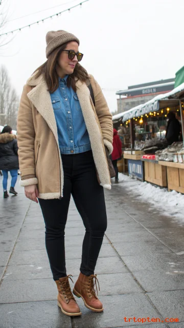 This look fits weekend plans, travel days, and outdoor markets. You can add gloves and a knit beanie for extra function. The mix of denim and shearling always looks relaxed and stylish.