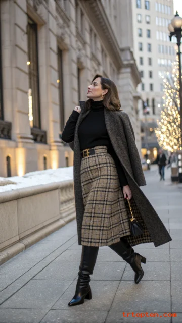 A turtleneck is a winter staple that works with many bottoms. A plaid skirt adds a classic seasonal pattern. Tall boots keep the outfit warm and give it a sharp finish.