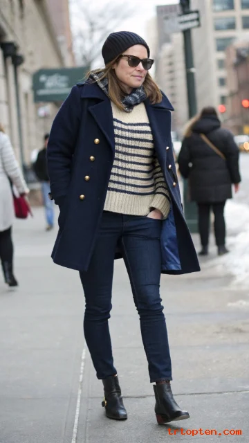 Choose a navy or black peacoat for a timeless look. Use a striped sweater in neutral shades for a softer style. Add ankle boots or loafers with socks based on the weather.