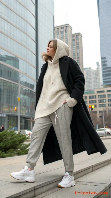 Pick a knit hoodie in a neutral color like gray or cream. Use wide-leg or straight wool trousers based on your style. Add sneakers for a relaxed look or boots for colder weather.