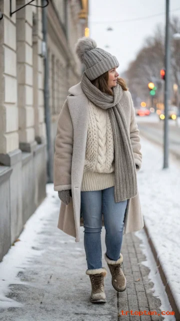 This outfit is great for daily winter use because it is easy and practical. You can repeat it with different coats and boots. The accessory set makes the outfit feel intentional.