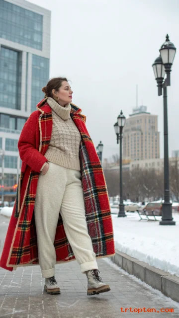 A statement coat can carry the whole outfit in winter. Use neutral layers like a knit top and simple trousers under it. Minimal boots help keep the focus on the coat.