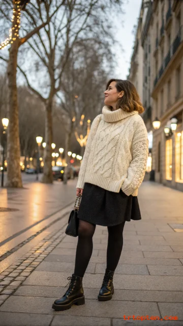 This outfit works for lunch dates, holiday shopping, and casual dinners. You can add a belt over the dress to define your waist. A small shoulder bag completes the outfit without making it heavy.