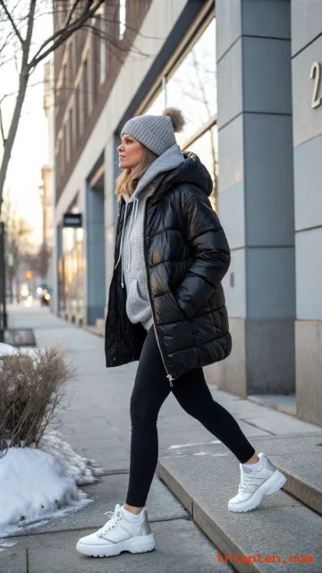 A puffer jacket gives strong warmth and a sporty winter look. A hoodie adds comfort and a casual layer under the jacket. Black leggings keep the outfit simple and easy to move in.