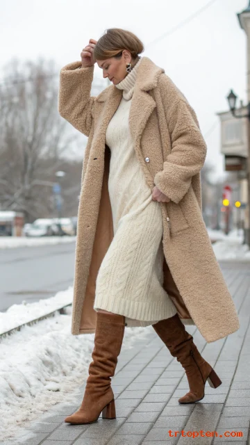 A teddy coat adds texture and warmth without much effort. A knit dress creates a soft winter outfit that looks feminine and cozy. Knee-high boots make the outfit feel polished and keep your legs warm.